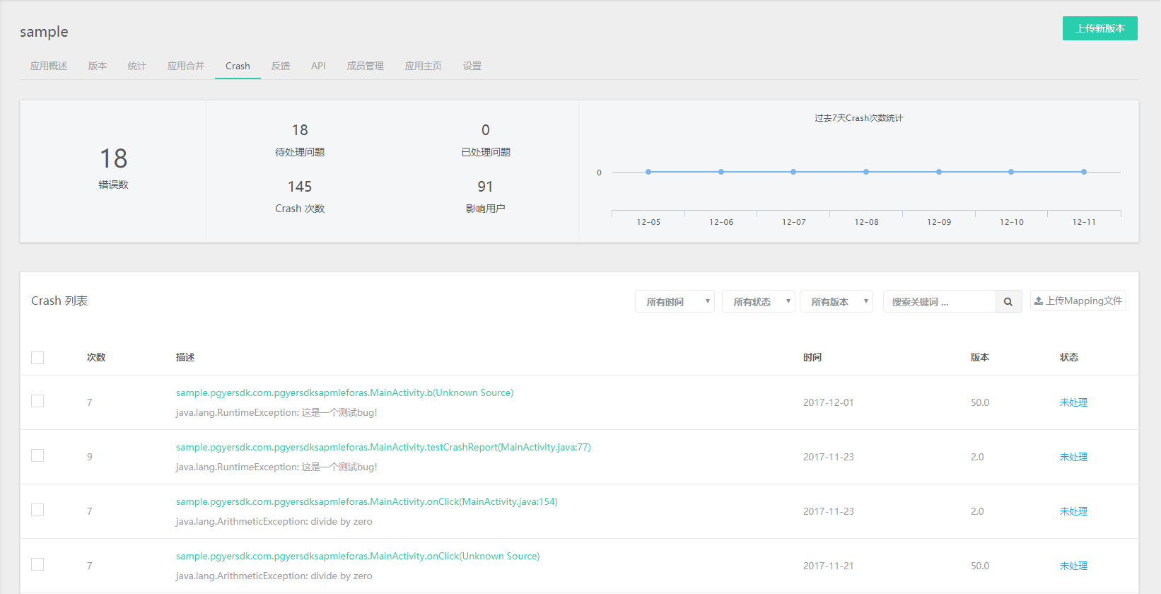 在Crash頁面可以查看應用的Crash統計,包括錯誤率、待處理問題、已處理問題、Crash次數及影響用戶數。